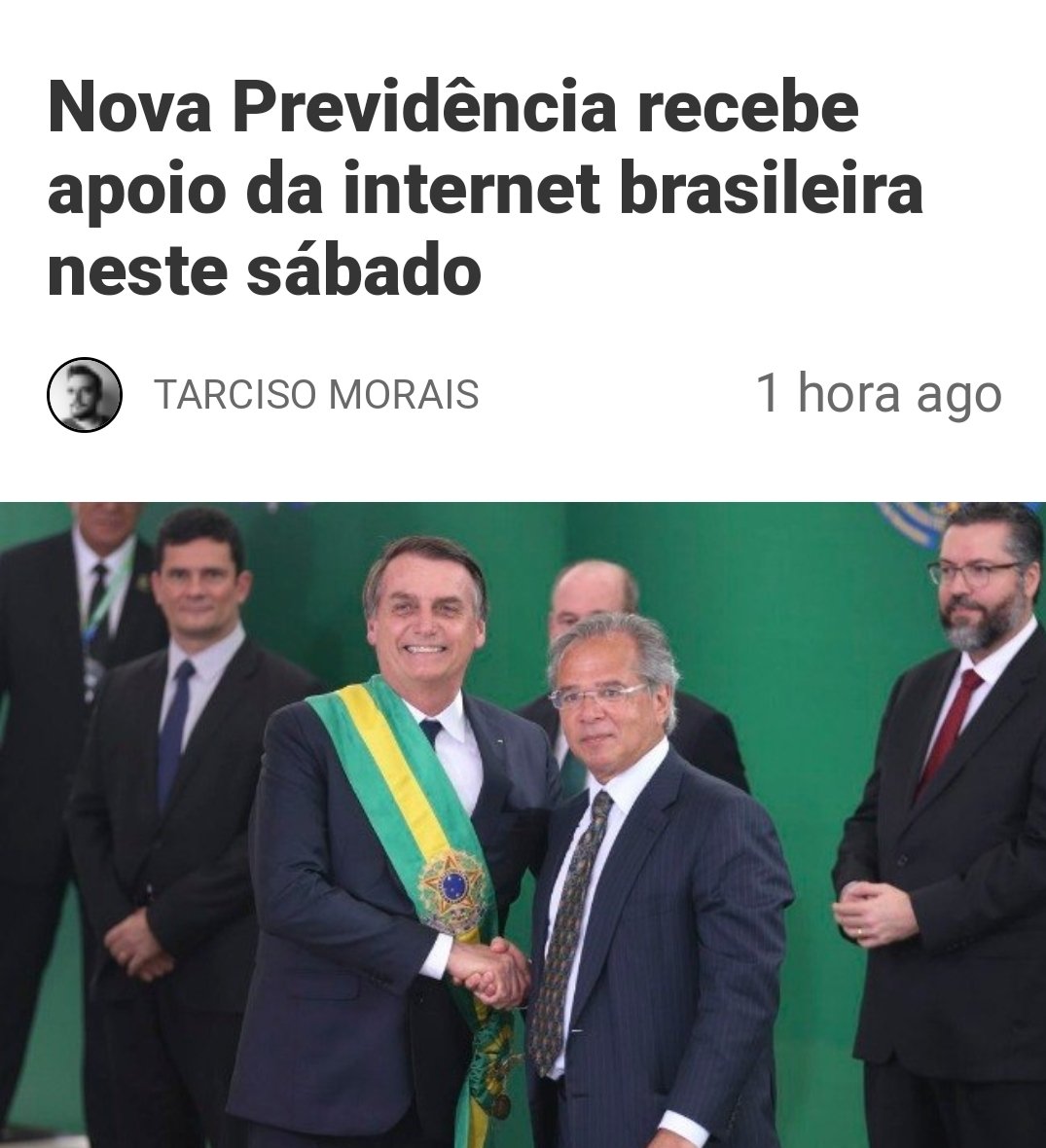 O Tuitaço segue com a hashtag #EuApoioNovaPrevidencia em alusão à Reforma da Previdência proposta pelo governo Bolsonaro. Ao mesmo tempo os internautas mandaram um recado direto à Câmara e Senado Federal que não aceitarão balcões de negócios. Deixe sua opinião nas redes sociais.